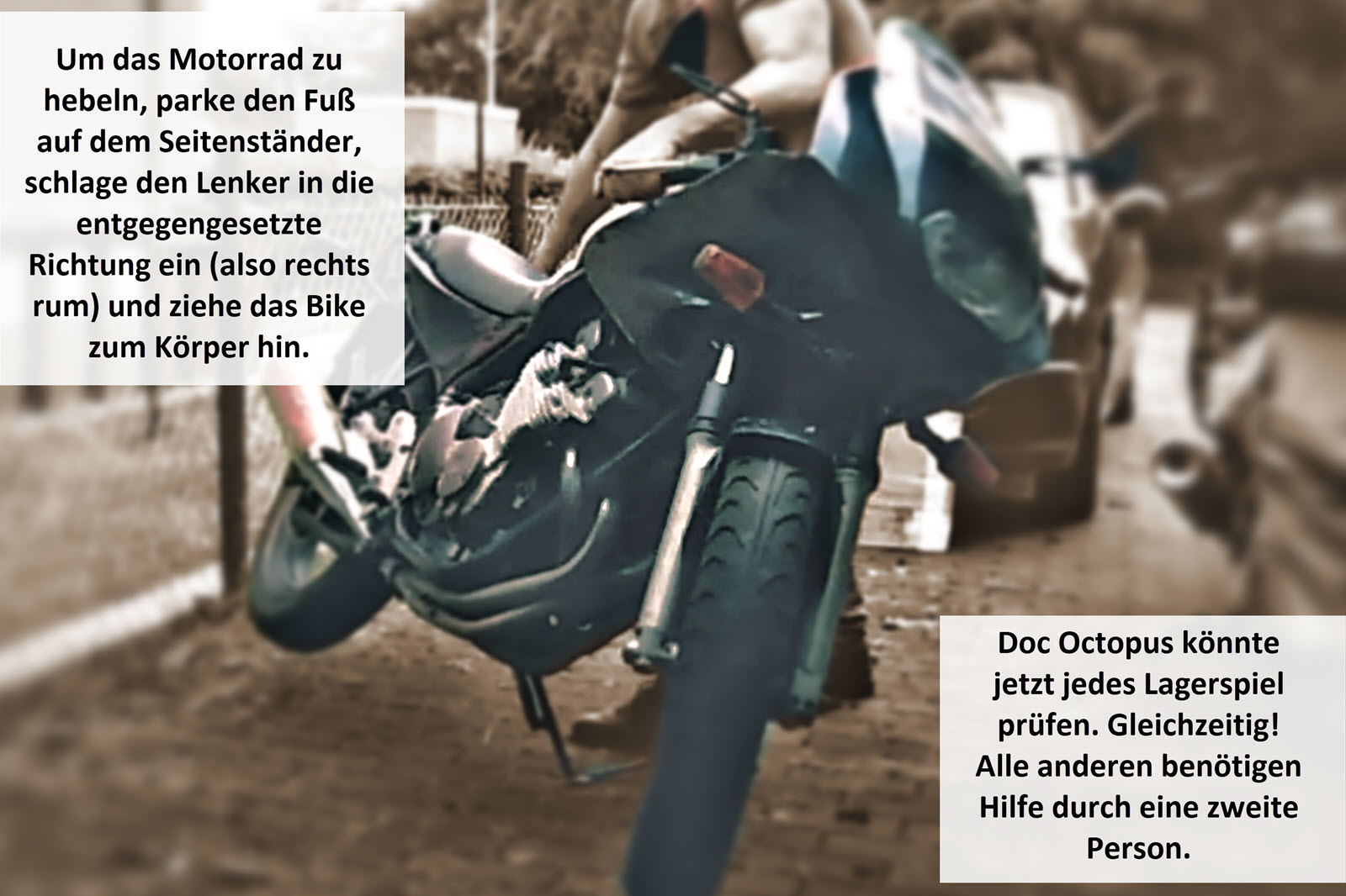 Überprüfungen von Zweirädern ohne Untersuchungen durch Werkstätten oder Fachleuten mit professionellem Equipment sind von Natur aus fehlerbehaftet und können zu unerwünschten Ergebnissen führen. Für alle auf Grundlage dieses Booklets vorgenommenen Besichtigungen übernimmt die jeweilige als Prüfer, Käufer oder Berater tätige Person das alleinige und uneingeschränkte Risiko; dieses Booklet dient einzig als Beitrag zur Selbsthilfe. Die Nutzung und Umsetzung der enthaltenen Informationen und Ratschläge setzen grundlegendes motorradtechnisches Verständnis voraus und sollten nicht ohne dieses angewendet werden. Im Zweifelsfall sind geschulte Spezialisten zu Rate zu ziehen. Eine Haftung durch den Autor kann nicht erfolgen.