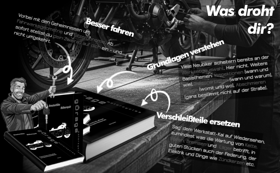 Arbeiten an einem Zweirad sind von Natur aus risikobehaftet und können bei fehlerhafter Ausführung und unter bestimmten Voraussetzungen zu erheblichen Folgeschäden führen. Für alle auf Grundlage dieses Buches vorgenommenen Arbeiten übernimmt die jeweilige als Schrauber, Bastler, Mechaniker oder in anderer Funktion tätige Person das alleinige und uneingeschränkte Risiko. Dieses Buch dient als Beitrag zu eigenverantwortlichem Arbeiten, als Hilfe zur Selbsthilfe. Die Nutzung und Umsetzung der enthaltenen Informationen und technischen Ratschlägen (auch jene, die keinen üblichen Handwerksregeln entsprechen) setzen handwerkliches Grundwissen und Geschick voraus und sollten nicht ohne diese angegangen werden. Im Zweifelsfall ist die Ausführung einer Arbeit an einen geschulten Spezialisten zu übertragen oder ein solcher zu Rate zu ziehen. Eine Haftung für Folgeschäden durch den Autor kann nicht erfolgen, Ausnahmen gelten bei Vorsatz oder grober Fahrlässigkeit, soweit Zusicherungen schriftlich abgegeben wurden sowie bei Schäden aufgrund der Verletzung von Körper, Gesundheit oder Leben sowie nach dem Produkthaftungsgesetz.
